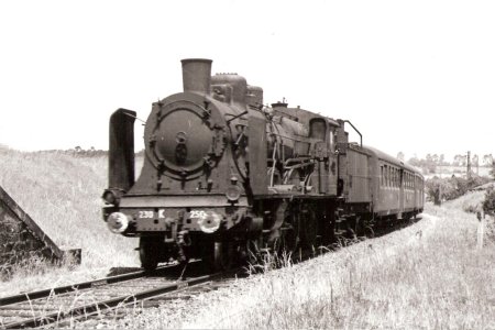 | Eté 64. La 230-B-720 de Bel. train 2842. 2 voitures CFF de 1ére et 2 eme classe. |