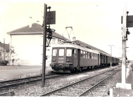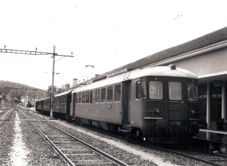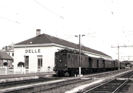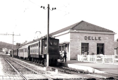 Gare de Delle, années 1960-65. La Be 4/7 N° 12504, retirée du service en 1976 et classée véhicule historique. (voir plus bas) |